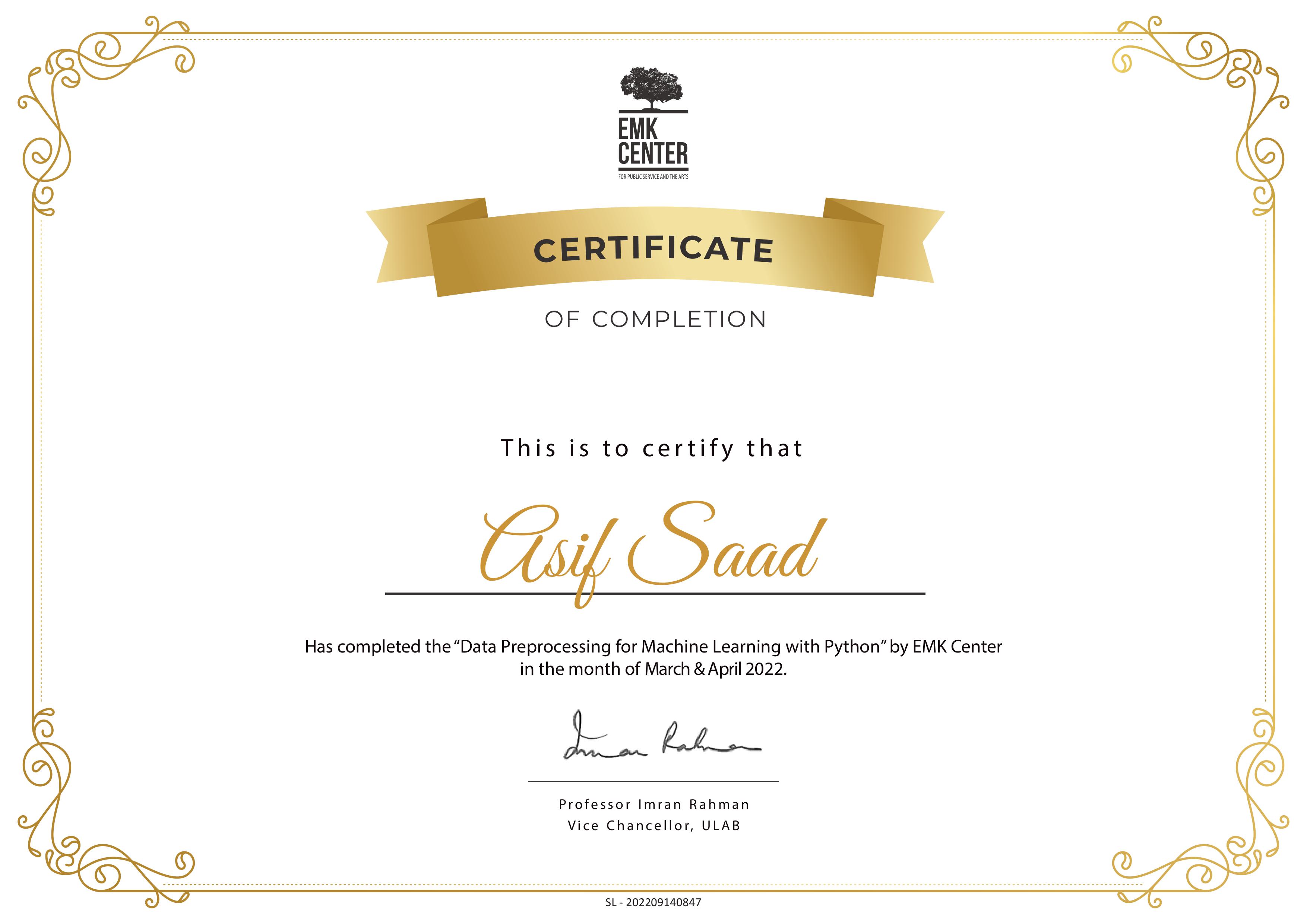 - Data Preprocessing for Machine Learning with Python (EMK Center, Mar–Apr 2022) – Completed hands-on training in data cleaning and preparation techniques using Python