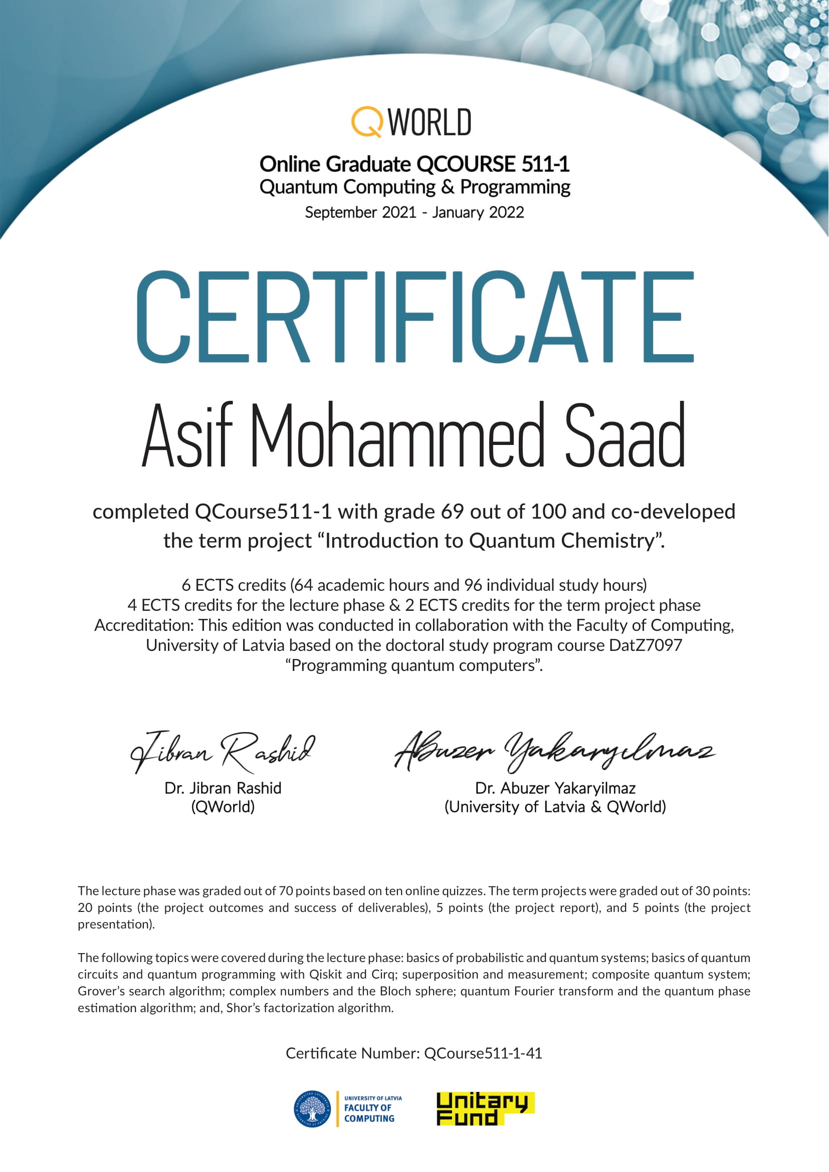 - Online Graduate QCOURSE 511-1: Quantum Computing & Programming (QWorld, Sep 2021–Jan 2022) – Completed with project co-development on “Introduction to Quantum Chemistry”