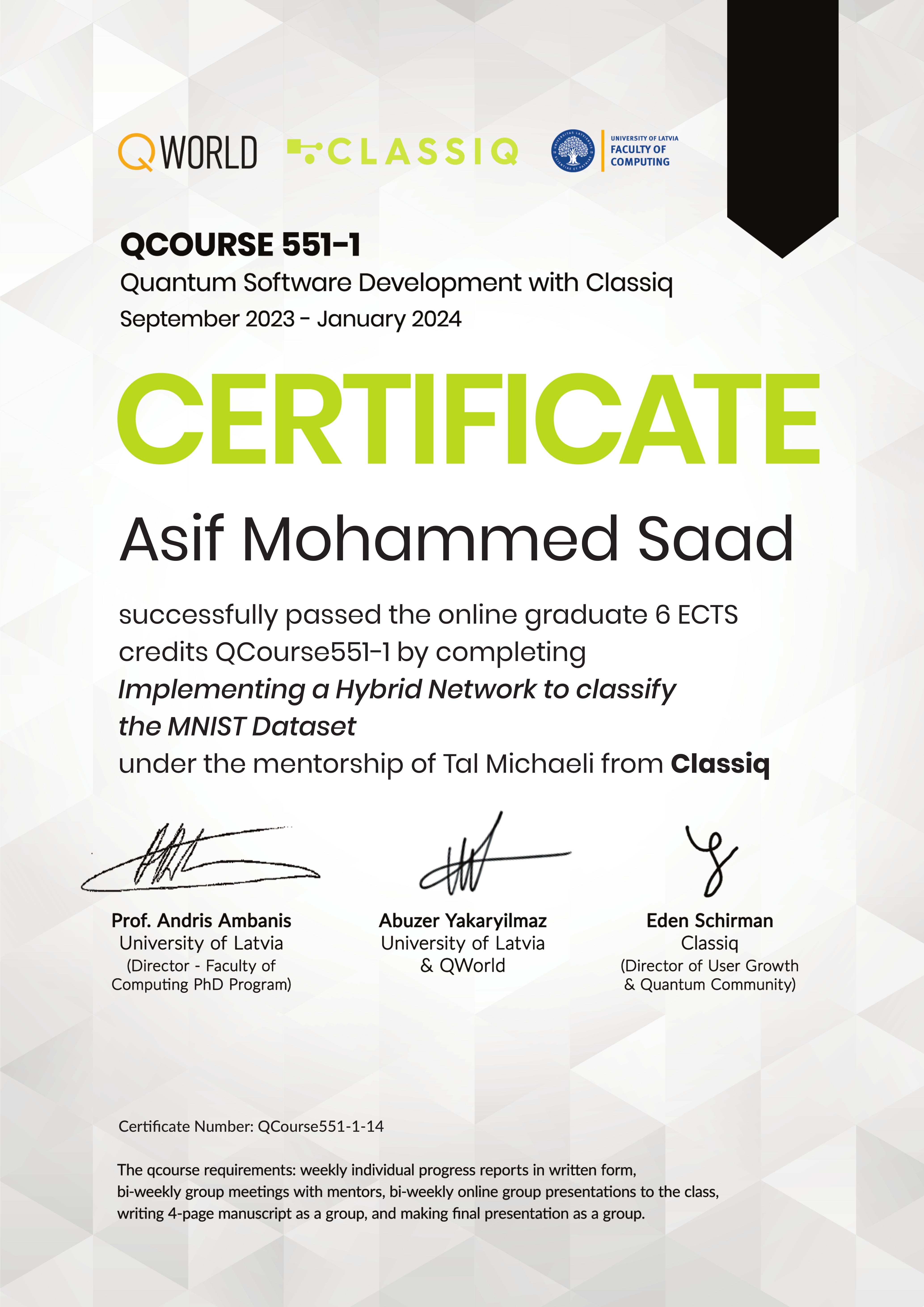 - Quantum Software Development with Classiq (QCourse 551-1, QWorld & University of Latvia, Sep 2023–Jan 2024) – Completed graduate-level project on hybrid neural networks for MNIST classification under expert mentorship
