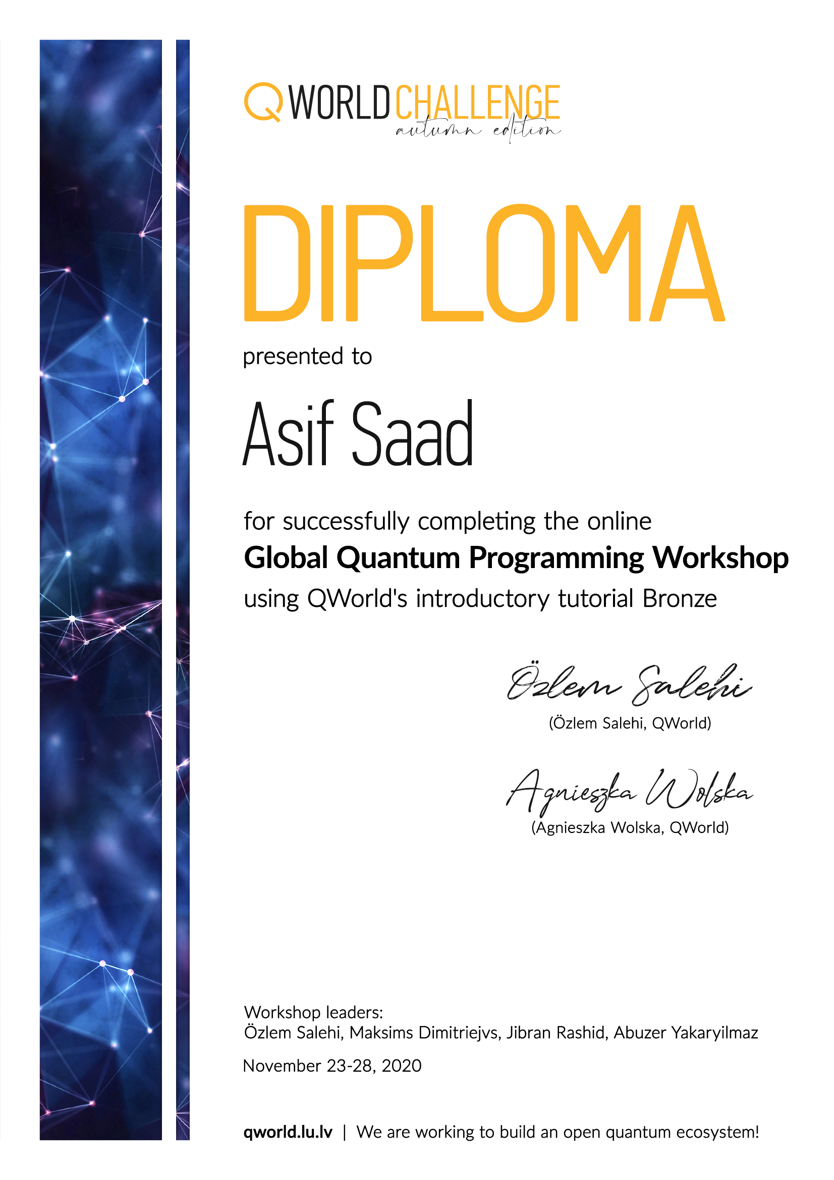 - Global Quantum Programming Workshop (QWorld Bronze) QWorld Challenge Autumn 2020 – Completed online workshop on quantum programming fundamentals